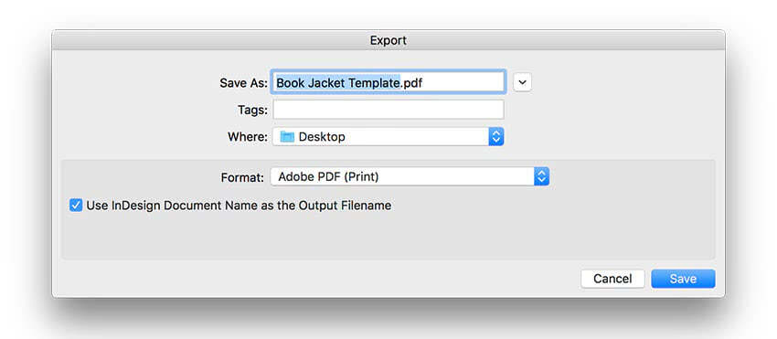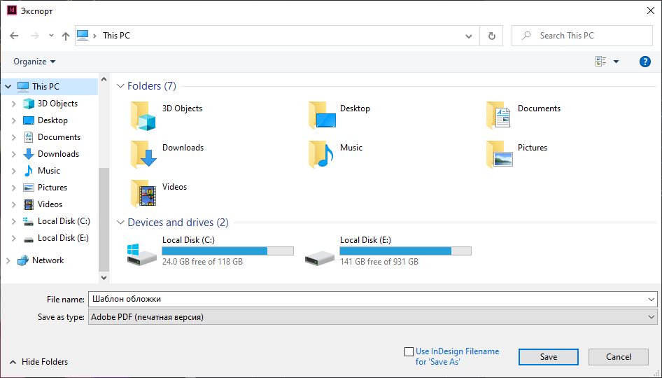 Для сохранения файла переходим File – Export (Файл – Экспорт). Называем файл «Шаблон обложки» и выпадающем меню с выбором формата находим Adobe PDF (Print) (Печатная версия). Жмем на кнопку Save (Сохранить).