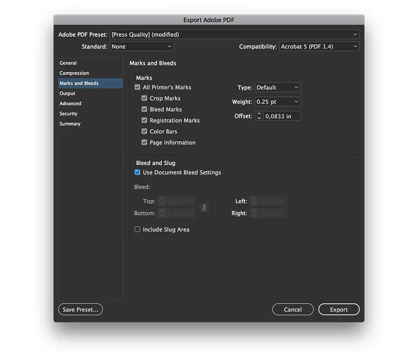 В левой части окна выбираем раздел Marks and Bleeds (Метки и выпуск за обрез). Ставим галочку напротив All Printer’s Marks (Все типографские метки) и Use Document Bleed Settings (Использовать настройки документа). Жмем на кнопку Export (Экспорт). В результате у вас на компьютере появится готовая для печати обложка в формате PDF.