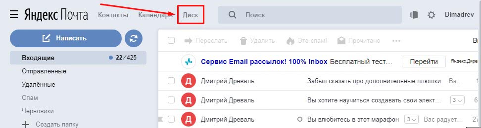 Захожу на свою почту на Яндексе. Нажимаю на кнопку «Диск»:
