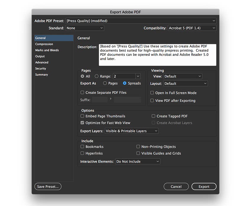 В открывшемся окне Export Adobe PDF (Экспорт Adobe PDF) в меню Adobe PDF Preset (Стиль Adobe PDF) выбираем Press Quality (Высококачественная печать).
