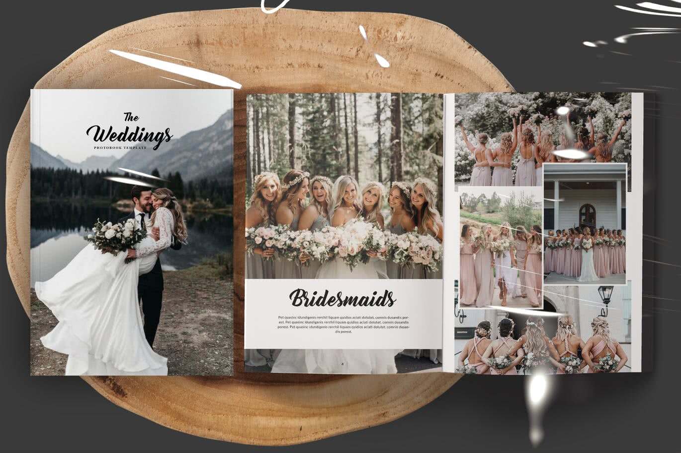 Оформление страниц альбома – также индивидуальный выбор. Интересным решением станет разбить альбом на несколько частей. В одной – профессиональные снимки фотографа, в другой – селфи с друзьями, в третьей – репортажные фотографии гостей свадьбы. Затем раздел снимков подарков или фото супругов в детстве.