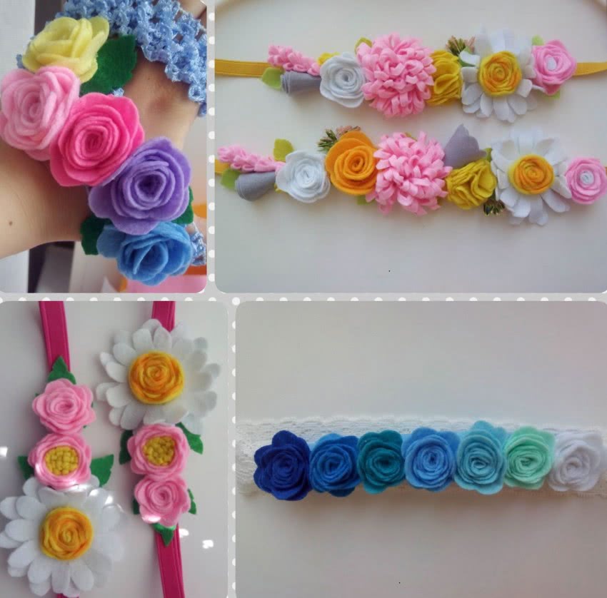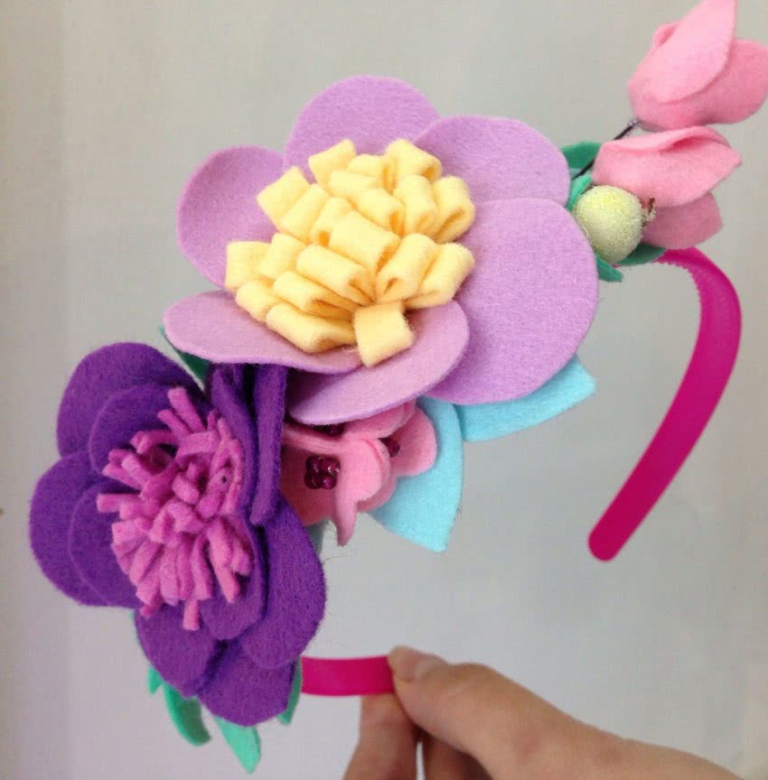 Такие оригинальные поделки вполне под силу даже неопытным новичкам. На фото можно посмотреть ободки с цветами для прически с интересными идеями.