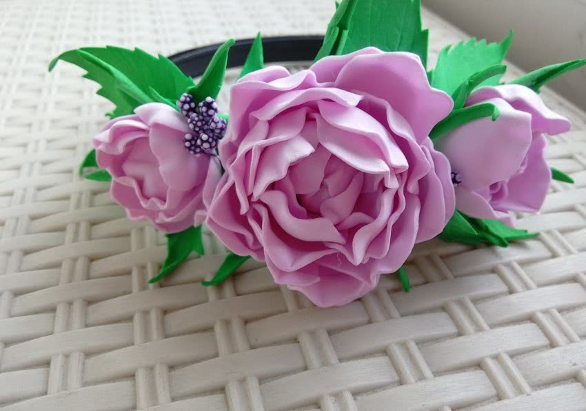 Цветы из пластичной замши выглядят как живые, работать с этим материалом легко и приятно. Ободок с розой роскошен!