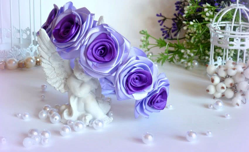 Также искусственные декоративные цветы можно сделать в технике канзаши из атласных лент.