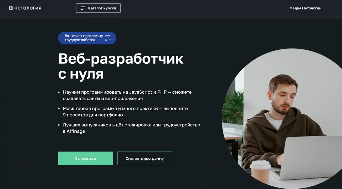 Профессия веб-разработчика от онлайн-школы Нетология подходит для тех, кто хочет создавать полезные сайты, мобильные приложения и боты для соцсетей. На курсе рассматриваются все необходимые аспекты для старта в карьере Fullstack-программиста: мобильная и адаптивная верстка, кодирование на языке JavaScript, объектно-ориентированный подход в PHP.