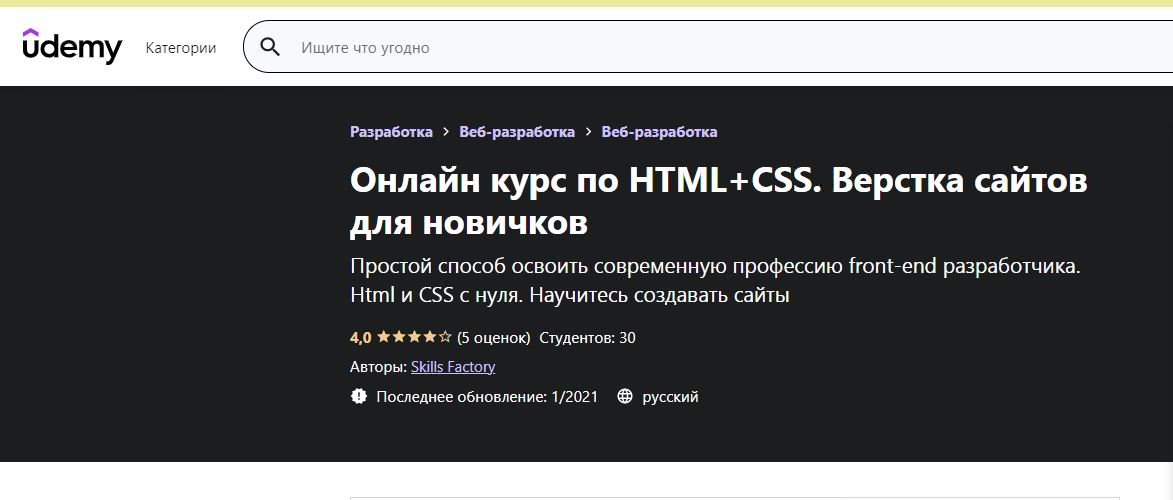 Udemy. «Онлайн курс по HTML+CSS. Верстка сайтов для новичков»