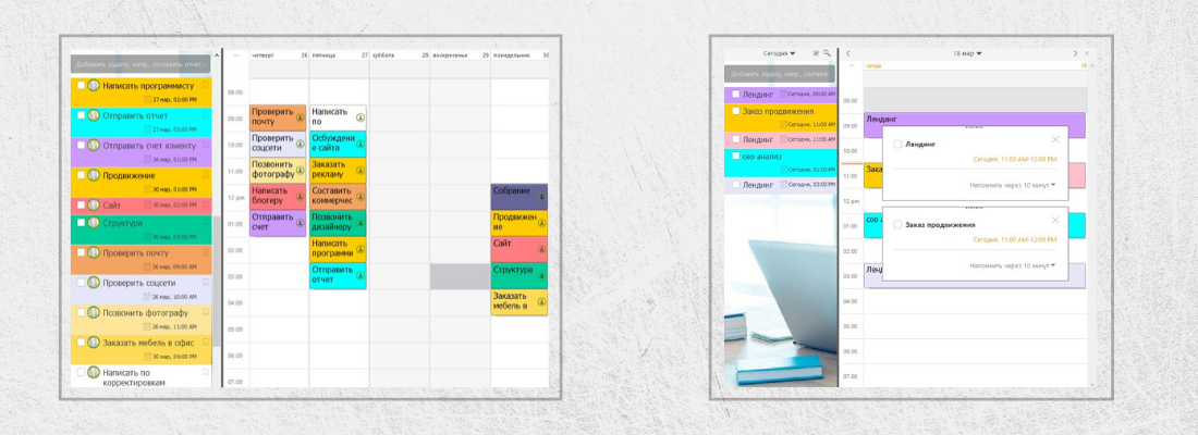 При создании задания устанавливают пометку «Срочно», «Важно», «На проверку». Приложение настраивают для работы по дням недели, в нужный час на экране появится всплывающее окно со звуковым сопровождением