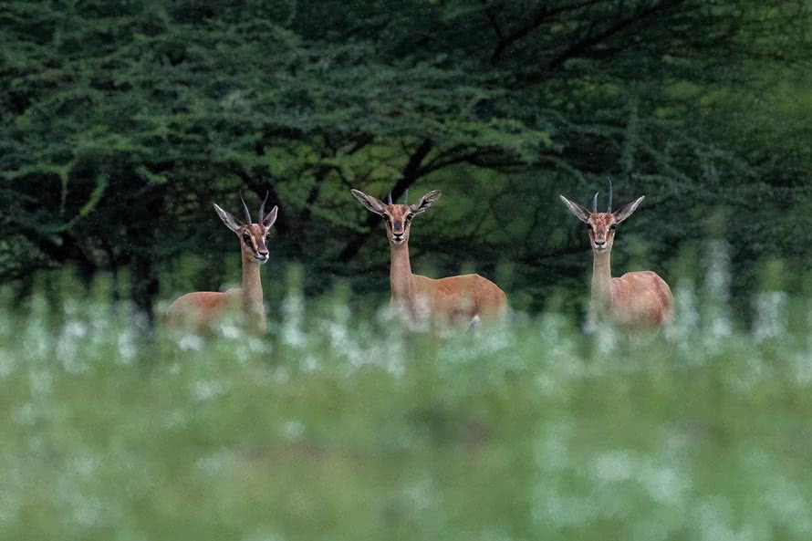 На этом изображении с газелями вместо съемки с уровня глаз я снимал с низкого уровня. Это помогло получить передний план в картине. Три чинкары двигались на встречу мне. Я ждал некоторое время, пока все не посмотрели в одном направлении. Я нажал на спуск, как только они посмотрели в мою сторону.