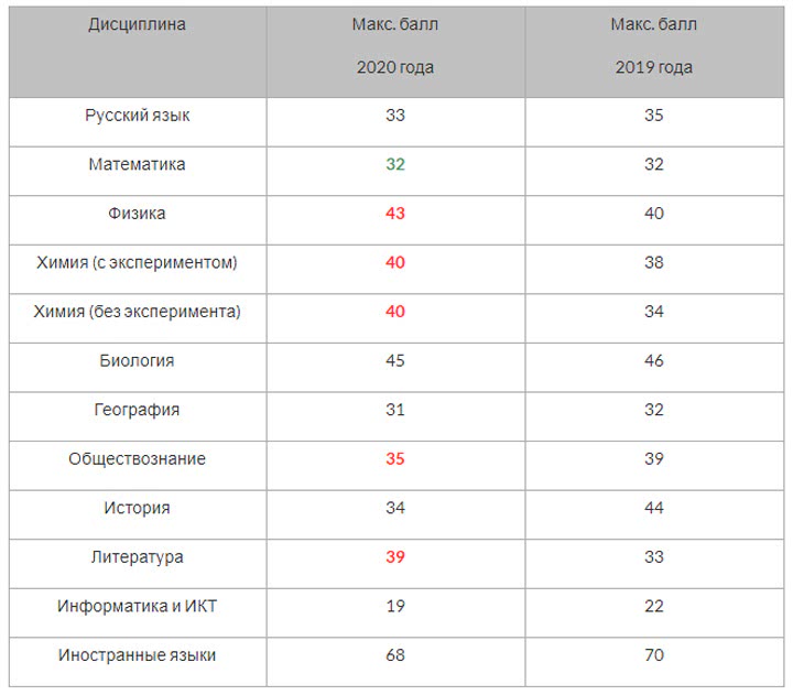 Также стоит учесть, что с 2020 года для ряда предметов установлены новые первичные баллы, что наглядно демонстрирует сравнительная таблица баллов 2019 и 2020 года.