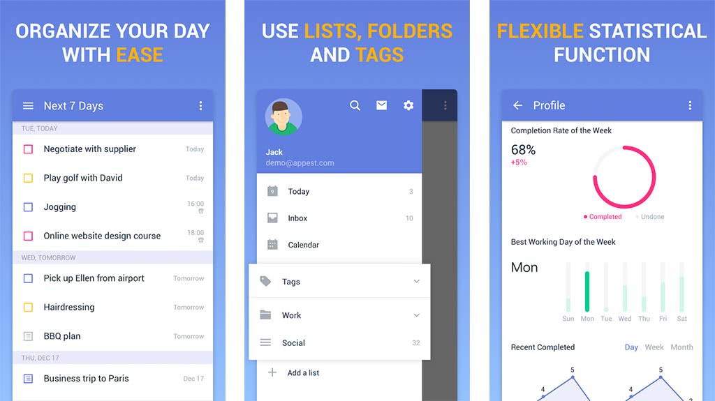 выведение ежедневной статистики. Особенностями TickTick считают не только поддержку нескольких ОС (iOS, Андроид, Виндоус), но и напоминания по времени и геолокации, быструю сортировку и поиск
