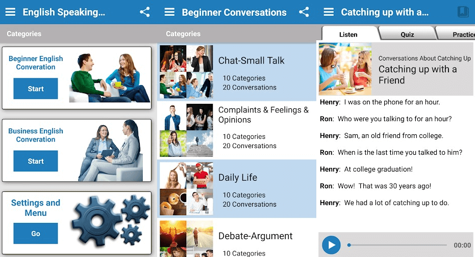Приложение включает в себя более 200 уроков разговорного английского языка, которые включает в себя следующее: