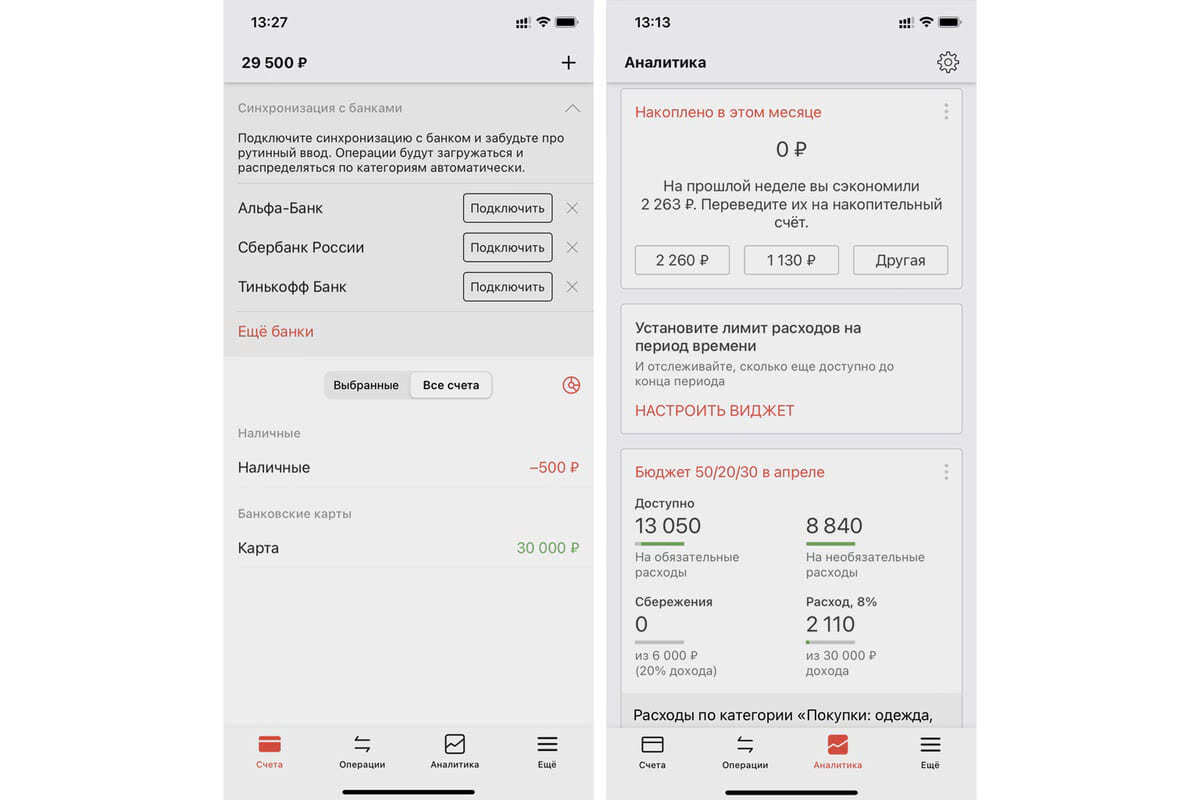 Примечательно, что в разделе «Аналитика» есть функция планирования бюджета по формуле 50/20/30, которая настраивается под нужды пользователя. Например, 50% дохода может идти на обязательные платежи (вы сами выбираете, какие считать таковыми), 20% — на сбережения, а 30% останутся свободными — на отдых, подарки и любые другие желания.
