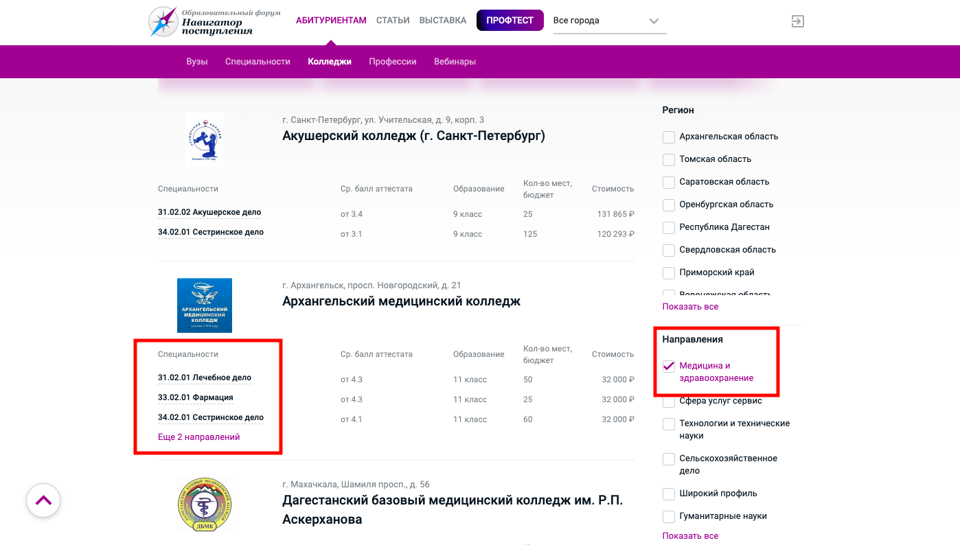 Все медицинские колледжи, в которых учат на лабораторного диагноста или зубного техника, вы можете посмотреть в разделе «Колледжи». Отметьте поле «Медицина и здравоохранение» в колонке справа.