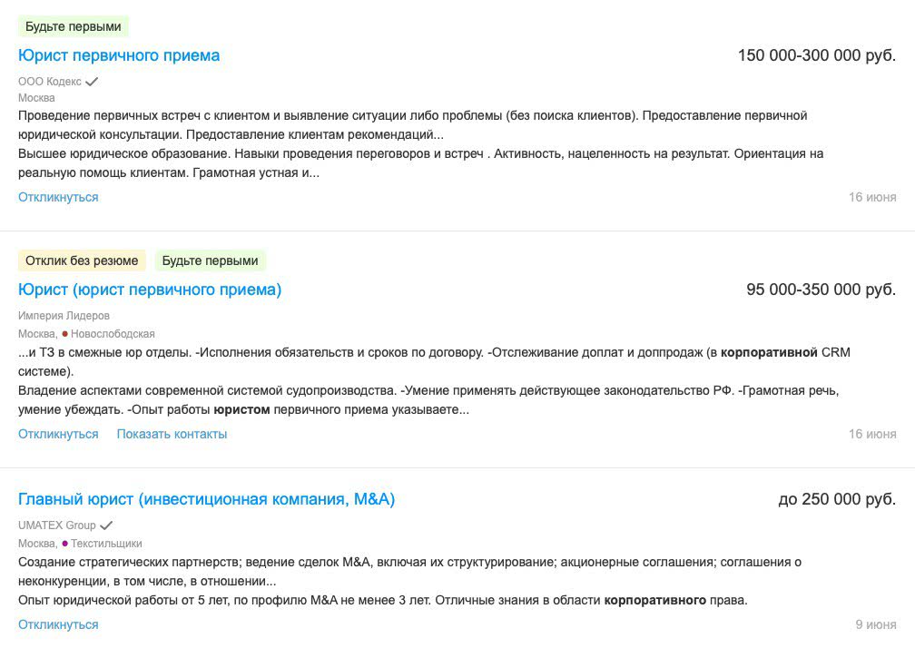 Столько же и даже больше получают корпоративные юристы, работающие в крупных частных компаниях. Соискатели могут рассчитывать на зарплаты от 100 тысяч рублей в месяц: