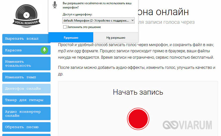 Vocalremover – неплохой онлайновый диктофон, позволяющий вести запись с микрофона с последующим базовым редактированием и сохранением в форматы MP3, WAV и OGG на выбор. После записи аудио можно прослушать, из эффектов доступны изменения тембра и размера «комнаты».