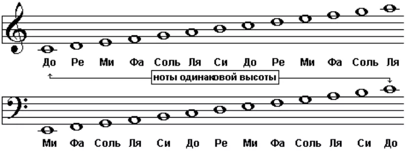 Точкой отсчета в обоих случаях является нота «до» 1-й октавы, и для нее предусмотрена добавочная линейка. Разница в том, что на верхнем нотоносце ноты идут снизу вверх, поэтому нота «до» 1-й октавы находится внизу. На нижнем нотоносце ноты идут сверху вниз, поэтому нота «до» 1-й октавы находится сверху.