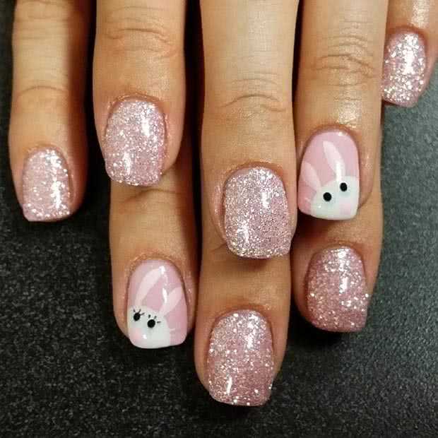 Как видно на фото, один из ногтей украшает симпатичный кролик. Нарисовать его можно тонкой кистью, тщательно прокрашивая мелкие детали.