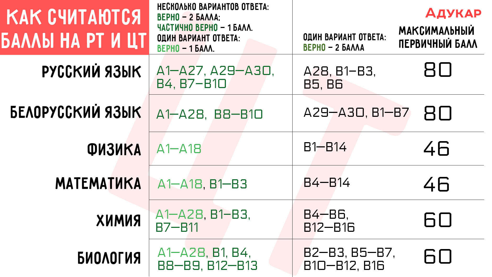 Для части А, где нужно выбрать только один верный ответ, первичный балл равен 0 или 1. В заданиях с несколькими правильными вариантами или на установление соответствия абитуриент получает 0, 1 или 2. В части В, где указывается краткий ответ — 0 либо 2 балла. Стоимость каждого задания во многом зависит от предмета. В таблице ниже ты увидишь разбивку по всем предметам в 2021 году. Учитывай, что она может отличаться из года в год, если вносятся изменения в структуру теста.