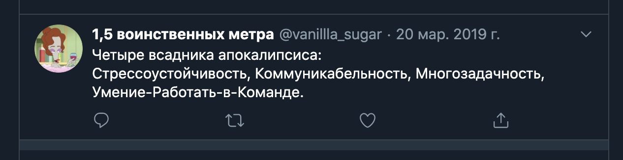 Еще отталкивает, когда текст вакансии на две страницы со списком обязанностей в сто пунктов, — это никто не будет читать. Также меньше откликов приходит, когда есть странные требования вроде «ищем маркетолога с высшим лингвистическим образованием».