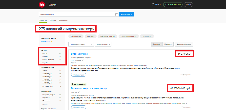 Данная площадка предназначена для поиска подходящих вакансий. Чтобы найти работу, пользователь должен зарегистрироваться и составить резюме. После этого можно искать вакансии в пределах своего города или других регионах. Часто видеомонтажерам предоставляется работа на дому.