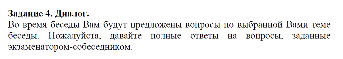 Что требуется. Четвёртое задание начнётся сразу после того, как вы завершите монолог, поэтому на подготовку времени не будет. Во время диалога экзаменатор-собеседник будет задавать вопросы по той теме, которую вы выбрали в третьем задании.