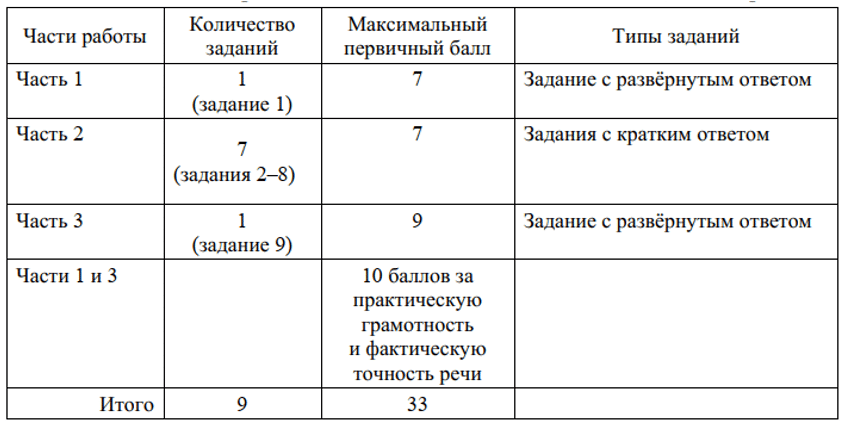 - III часть — сочинение-рассуждение (одно из трёх на выбор). Максимальный балл за любое сочинение — 9.