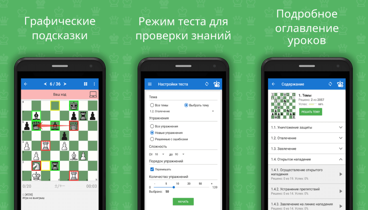 ChessKingразработали его на основе книги Сергея Иващенко «Учебник шахматных комбинаций». 1275 упражнений для тренировки по двенадцати темам. Занимайтесь сразу по всем или выбирайте в настройках и прорабатывайте конкретное направление: учиться делать двойной шах, мат ферзем, «съедать коня» и осваивать другие игровые ходы. Проходите те упражнения, где раньше допустили ошибку. Сложность заданий рассчитывается от десяти до девяноста.