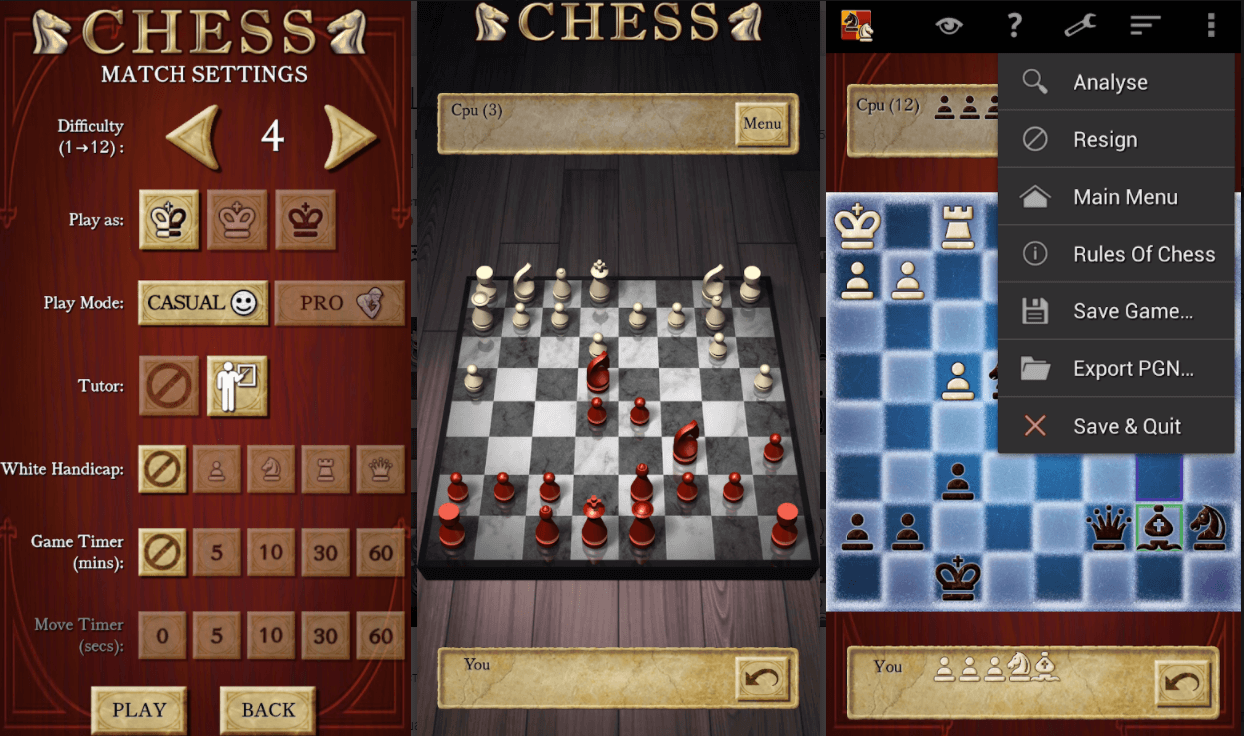 Chess использует шахматный движок Treebeard, который, по мнению многих игроков, отличается «человечностью». Есть 12 уровней сложности, от Новичка до Эксперта и 2 режима игры: Обычный и Профессионал. А также имеется встроенный самоучитель, возможность заглянуть в мыслительный процесс вашего ИИ-оппонента, а само приложение ведет статистику, список достижений и лидеров, а также рейтинг Эло. Все это — далеко не полный список, и моя рекомендация проста: если вы не хотите где-то регистрироваться — это лучший выбор для игры в шахматы на Android.