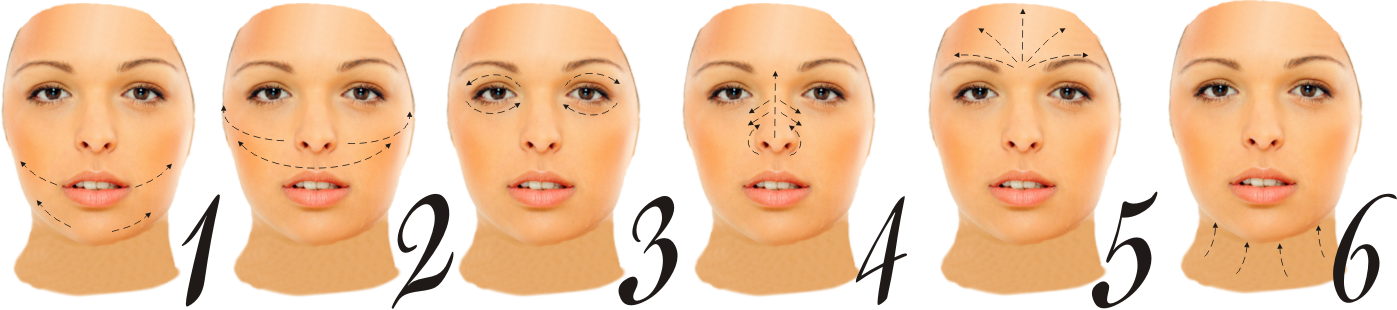 - поглаживающие — от средней линии по нижнему краю челюсти в сторону заушных областей, от крыльев носа к мочке уха, от углов рта к раковинам ушей. Дополняют плоскостным глажением и щипцеобразным поглаживанием;