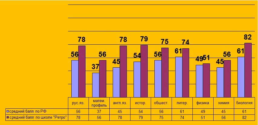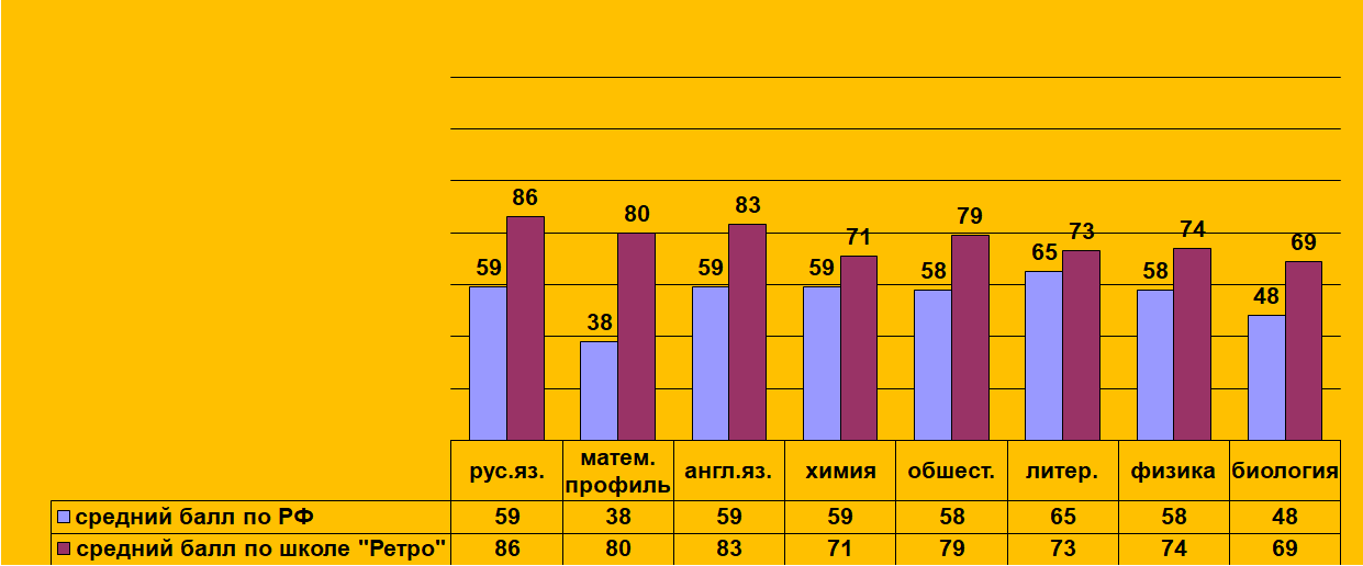 Средние баллы в школе Ретро на фоне средних баллов по РФ в 2017 году |
