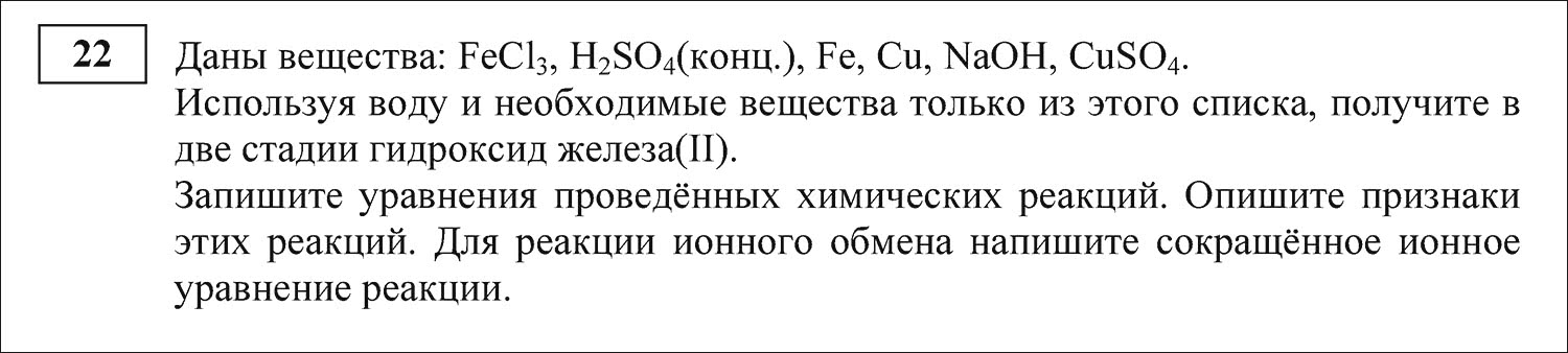 Задание № 22. Даётся список веществ, и необходимо получить заданное соединение в две стадии, описать признаки реакций и записать сокращённое ионное уравнение одной из реакций.
