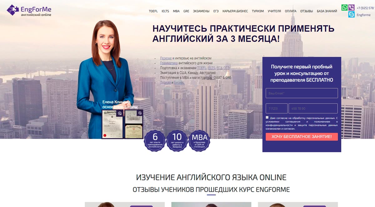 Выберите лучших преподавателей Москвы, чтобы помочь людям соответствовать личным и профессиональным стандартам со всего мира. Прежде чем начать обучение в Engforme, нужно оценить текущий уровень знаний с помощью бесплатного теста. Ознакомьтесь с отзывами клиентов, которые прошли успешное обучение в онлайн школе английского языка.
