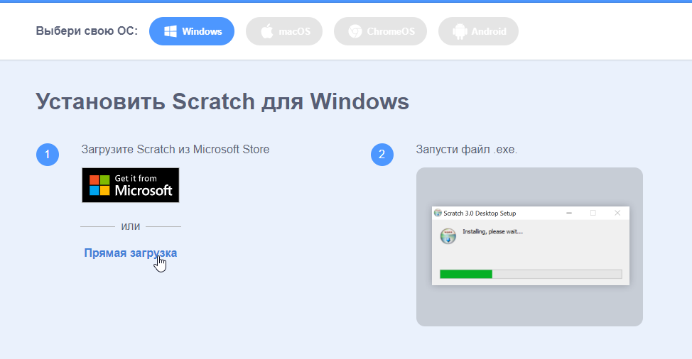 На момент написания статьи актуальна версия 3.23.1, которая представлена несколькими реализациями: для Windows, MacOS, ChromeOS и Android. Первые две можно взять прямо с сайта программы: https://scratch.mit.edu/download