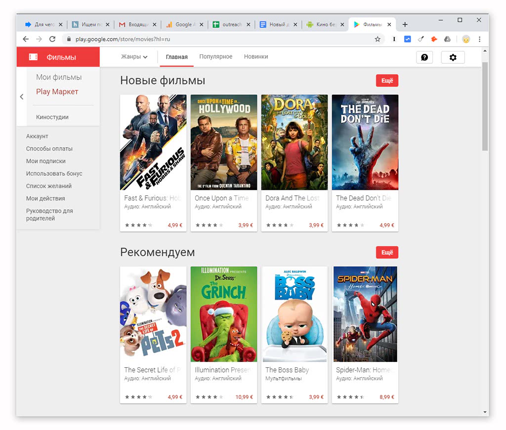 Магазин контента Google позволяет покупать и брать в прокат лучшие произведения мировой киноиндустрии от Disney, Universal, Paramount, Sony, Warner Bros, 20th Century Fox. В базе магазина несколько тысяч фильмов, популярных франшиз и анимационных картин. Причём в отличие от iTunes тут и цены порой несколько ниже, и ограничения поддерживаемых устройств отсутствуют. Весь контент доступен на компьютере в браузере Chrome, на смартфонах и планшетах с Android, на iPhone или iPad, на телевизорах с Android TV. К минусам можно отнести крайне небольшое количество российских фильмов. Основной упор Google делает на голливудские картины.