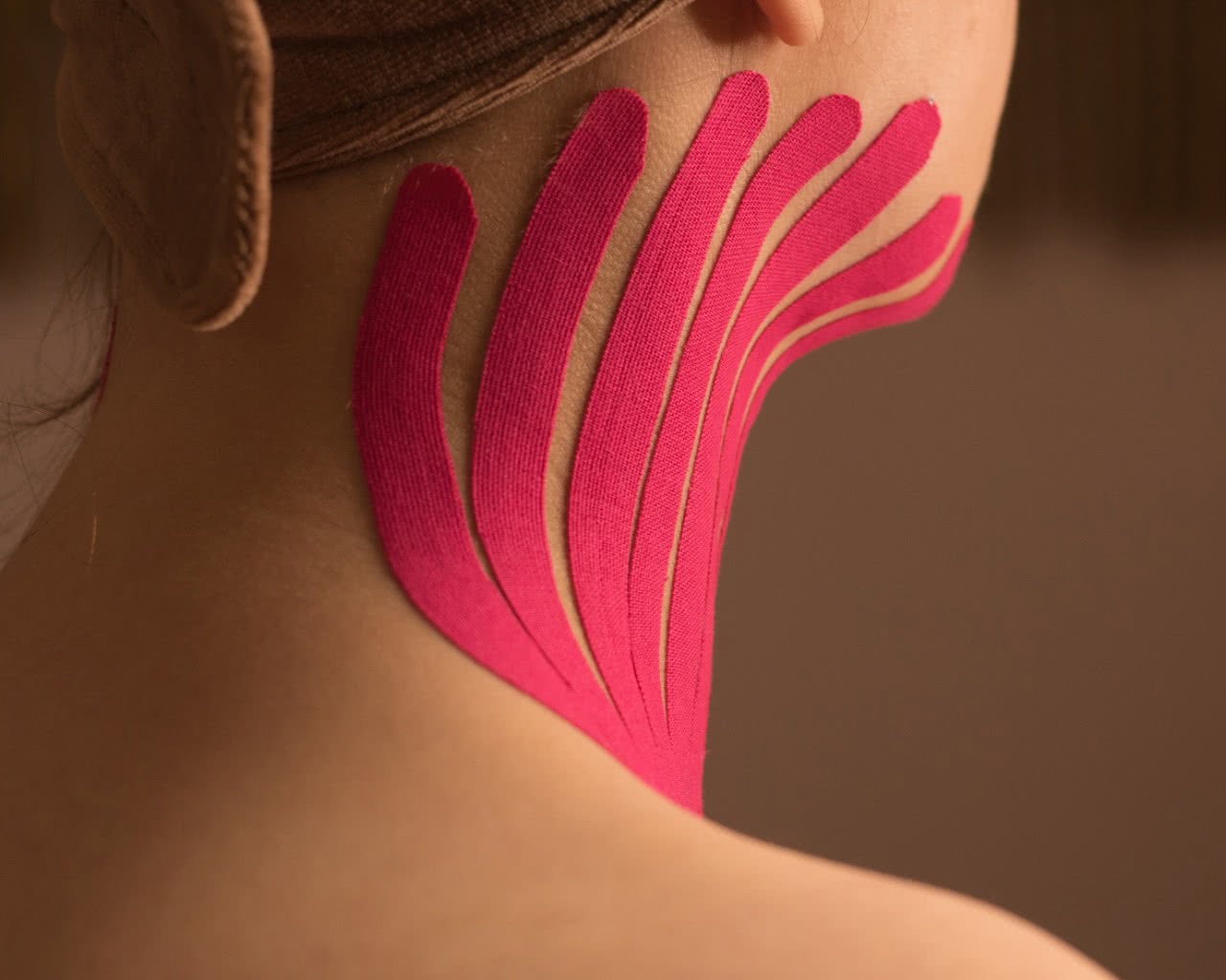 Кинезио тейп. Используется на мягких тканях тела для устранения болевого синдрома в мышцах. Не ограничивает движений, стимулирует кровообращение и поддерживает мышцы.