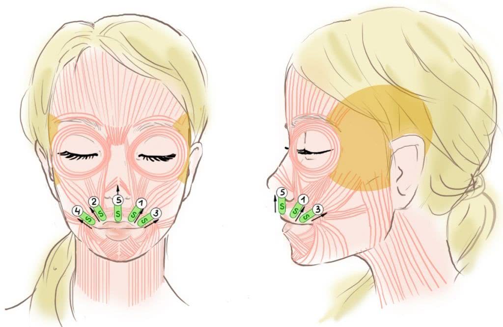 Тейпирование основано на способности приклеенной эластичной ленты оттягивать кожу на себя. Давление в подкожном слое уменьшается, в результате движение крови и лимфы становится свободнее. Питание клеток кожи лица улучшается, и застойные явления исчезают.