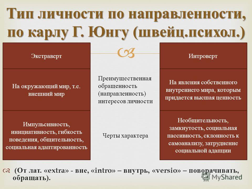 Одной из самых популярных теорий, позволяющей определить какие бывают люди по типу, является учение, основанное на функциях человеческой психики. Швейцарским психиатром Карлом Юнгом была представлена шкала интроверсии и экстраверсии. Он полагал, что личности можно разделить на два типа: