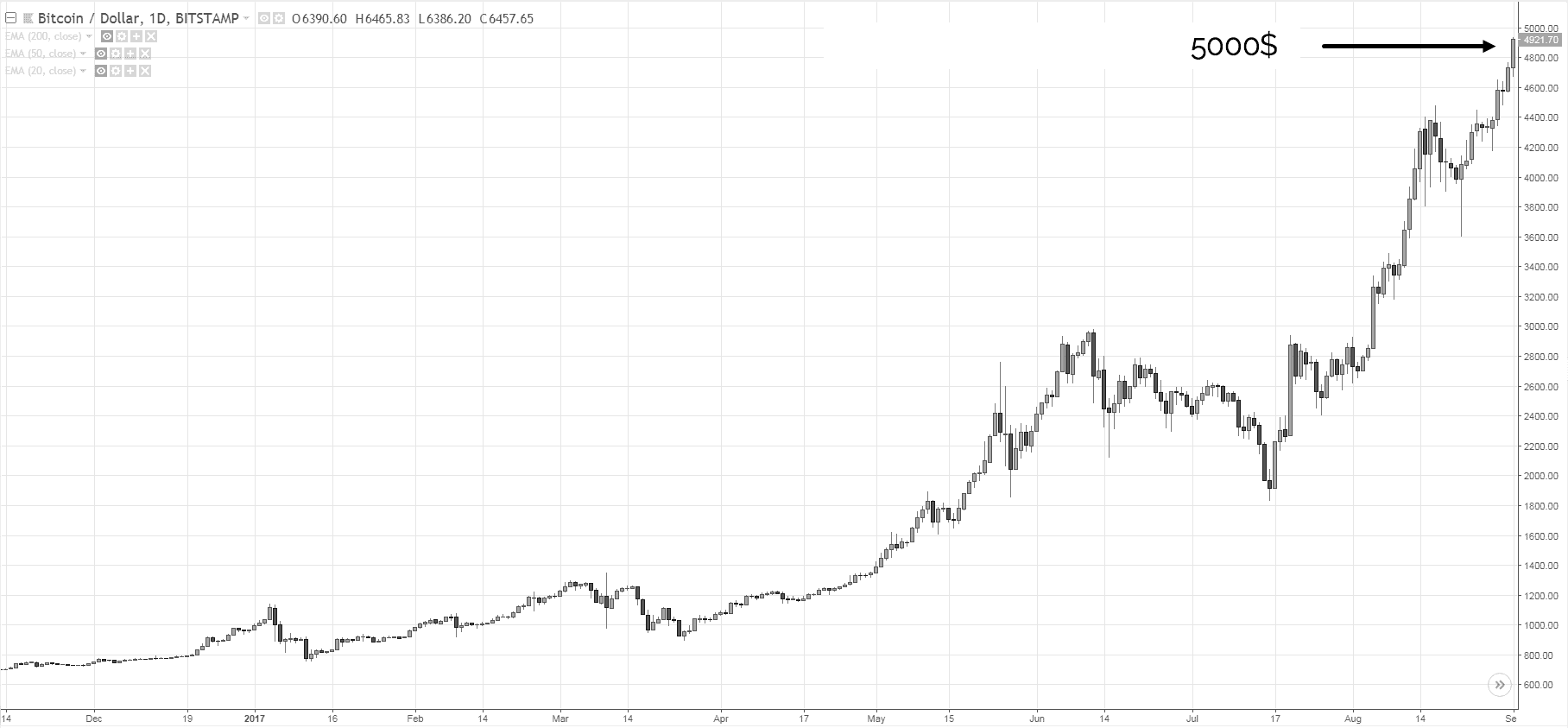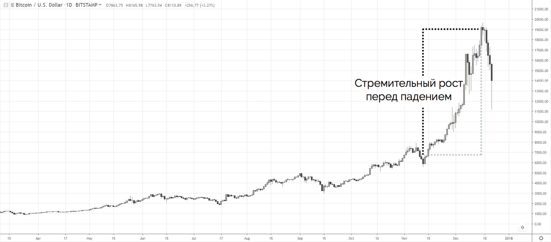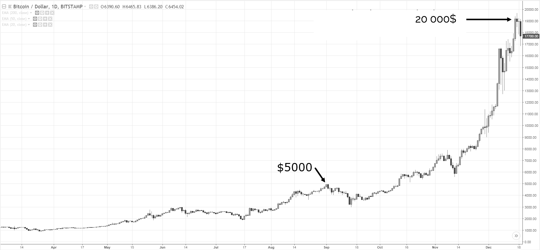 К примеру, биткоин резко вырос до 20 000 долларов (декабрь 2017 года) всего за несколько недель.