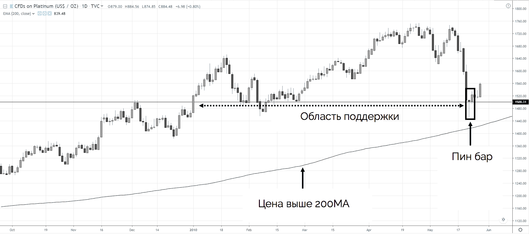 Затем пусть рынок покажет признаки силы (это может быть, к примеру, пин бар). Наконец, используйте значимую область, чтобы установить свой стоп-лосс.
