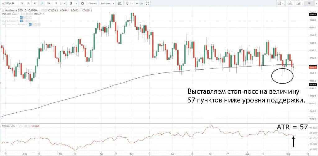 Индикатор ATR измеряет волатильность рынка, и мы можем использовать его для установки стоп-лосса. Прибавляем текущее значение ATR к цене входа и умножаем его на множитель (1 или 2).