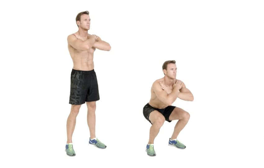 - Вдохните и присядьте так, чтобы бедра находились параллельно полу, а ступни не отрывались от пола;