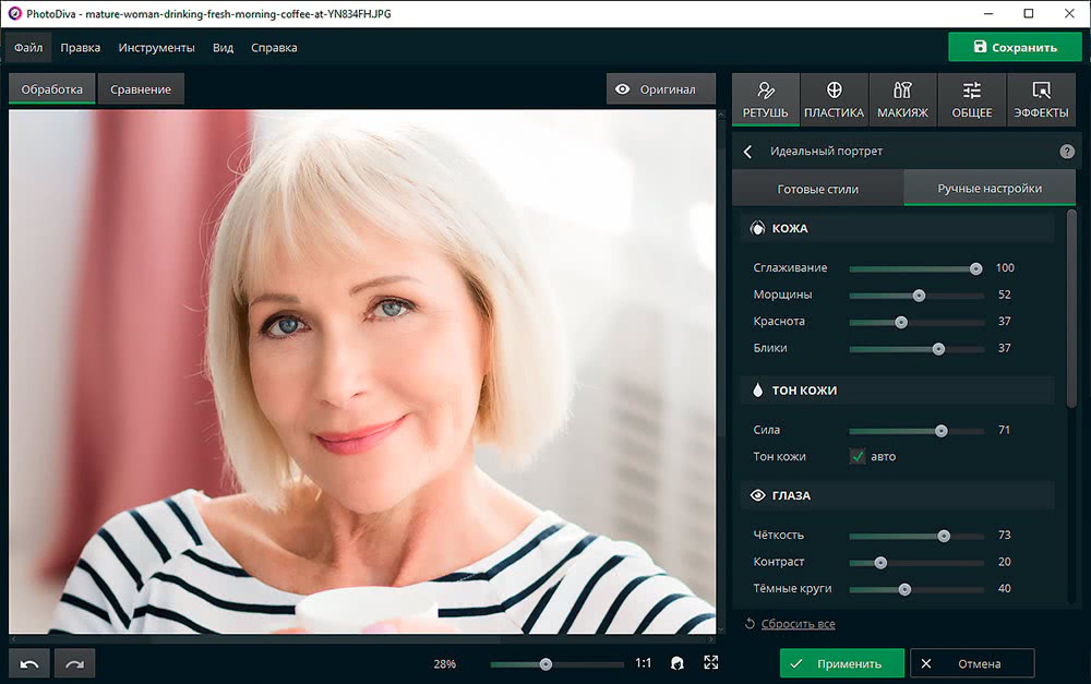 PhotoDiva предлагает и более тонкую коррекцию отдельных участков фото. Для этого перейдите в режим ручных настроек. Грамотное сочетание представленных параметров поможет качественно замаскировать и более серьёзные морщины.