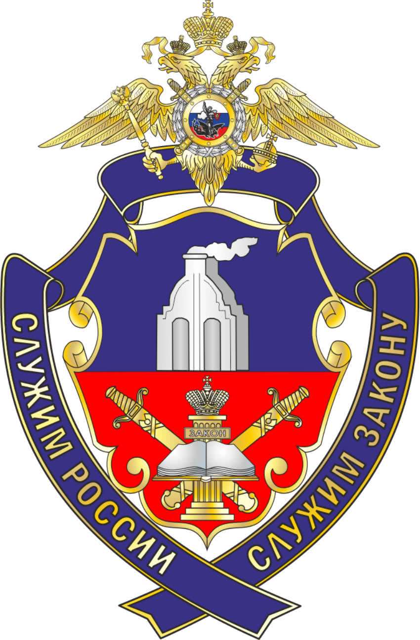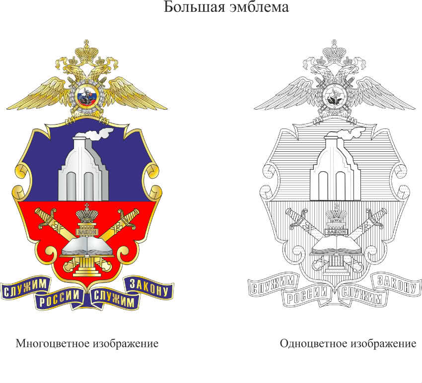 В качестве надглавной фигуры выступает геральдический знак МВД России — золотой двуглавый орел с распростертыми крыльями, увенчанный одной большой и двумя малыми коронами. На груди орла — круглый щит цветов Государственного флага Российской Федерации с изображением пешего воина, поражающего копьем дракона; щит наложен на скрещенные золотые мечи и окаймлен серебряным лавровым венком; в лапах орел держит щит эмблемы.