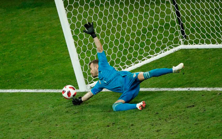 Фото 4. Голкипер сборной Словении Ян Облак просчитывает траекторию мяча, чтобы предотвратить гол в результате прострельной передачи.