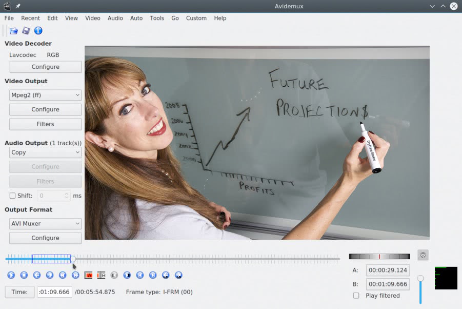 Avidemux — это лучший бесплатный видеоредактор с открытым исходным кодом, предназначенная для обработки роликов и перекодирования. Она применяется для простого редактирования видео. ПО может выполнять основные функции: нарезка, вырезание, кодирование, коррекция кадра и наложение цветовых фильтров. Софт работает с несколькими видеоформатами: MPEG, AVI и MP4.