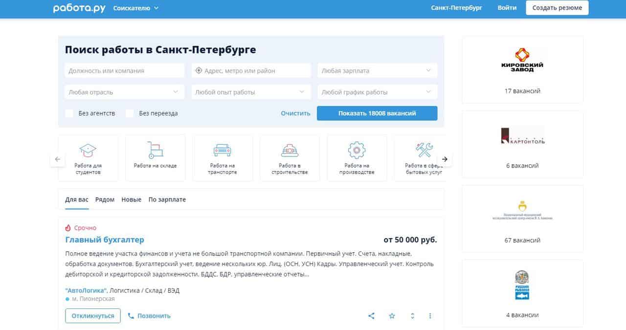 Пожалуй, это лучший сайт вакансий для специалистов средней квалификации в России. Основная ориентация портала «Работа» — сотрудники «среднего звена». Этот ресурс подойдет для поиска работы: