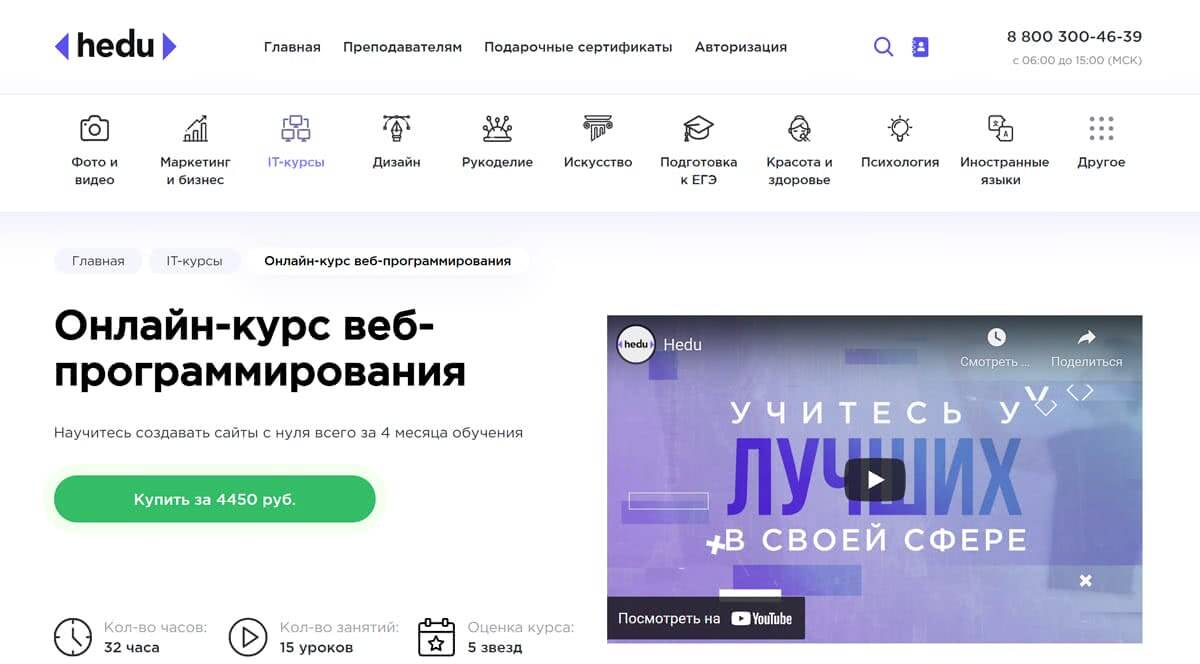Для ознакомления с форматом и подачей материала, HEDU открывает бесплатный доступ к первому занятию. Программа адаптирована для новичков и будет понятна тем, кто до этого не изучал web-разработку и написание скриптов. Онлайн школа HEDU занимает 5 место в подборке лучших ресурсов для обучения веб-программированию.