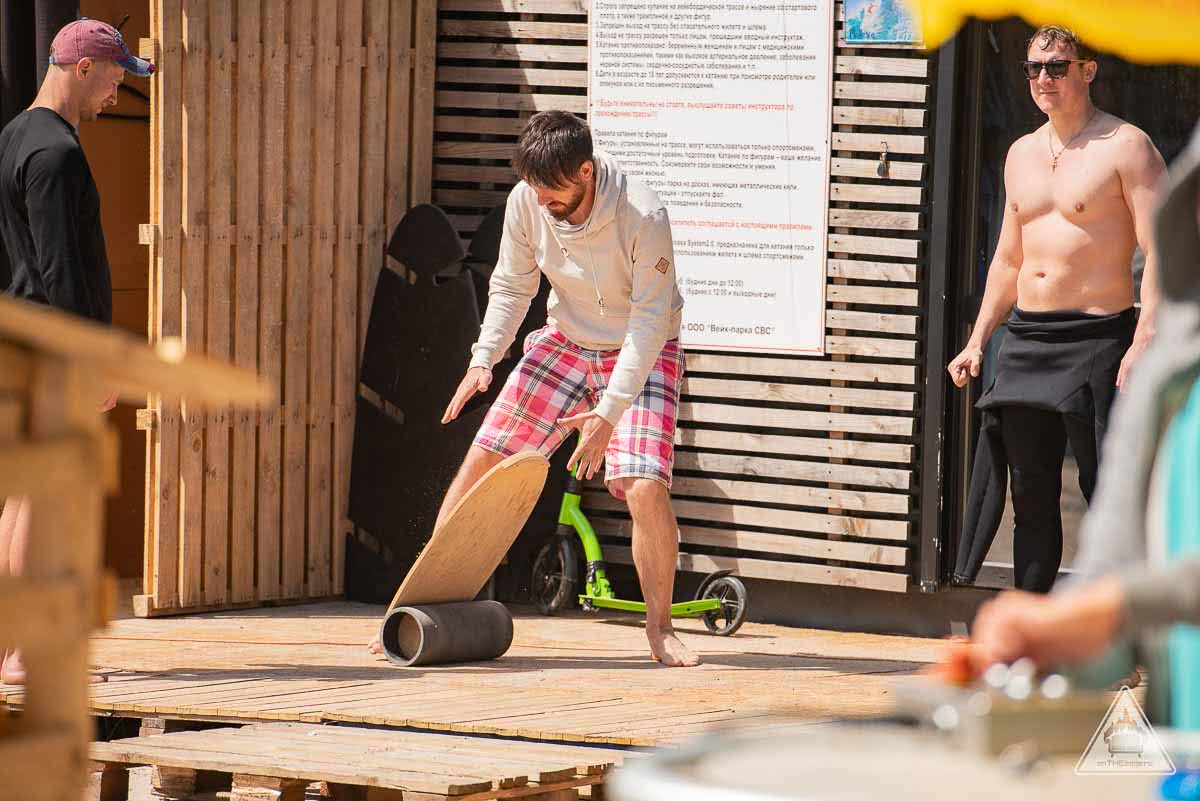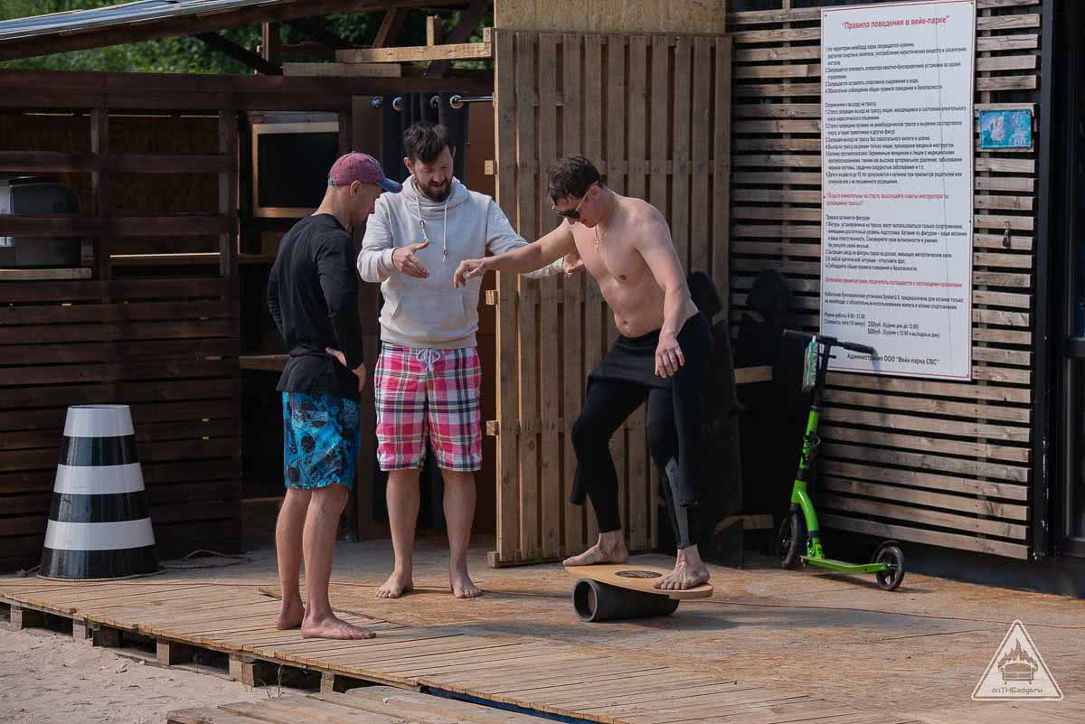 Баланс борд — отличный тренажер равновесия. Советую попробовать, как делали это мы в перерывах между катаниями на вейкборде.
