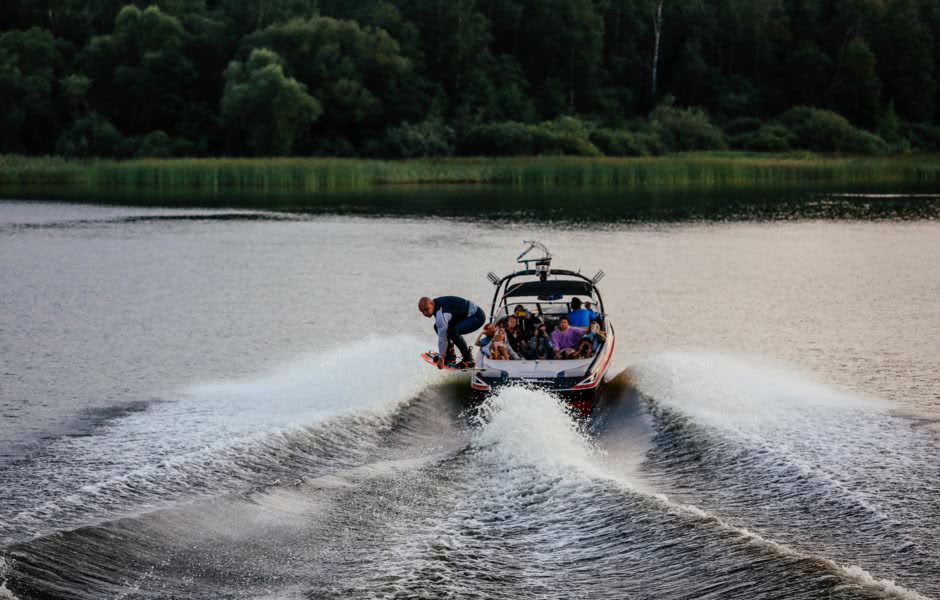 Тут необязательно быть экспертом в моделях катеров. Показатель простой: если цена сильно ниже рынка, почти гарантированно катать вас будут за чем-то, что в прошлой жизни было утюгом. В целом, у вейкборда нет строгих требований к волне, которую создает катер: кому-то нравится повыше и поострее, кому-то — помягче. А вот наличие специальных доработок реально играет роль. Из основного: «тауэр» (металлическая дуга высотой около 2,5 м для крепления фала), смещенный под днище винт и доработанная рулевая система, которая позволяет возвращаться за упавшими вейкбордистами по заметно меньшему радиусу.