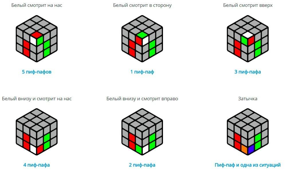 На изображении ниже Вы можете увидеть возможные выпавшие комбинации и количество “пиф-пафов” для каждого отдельного случая (последний вариант предусматривает нахождение белого угла на нижнем слое):